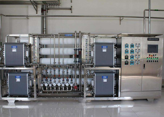 广东电子工厂安装EDI超纯水现场,通过原水进入EDI系统,电去离子净水技术,将离子交换技术、离子交换膜技术和离子电迁移技术相结合的纯水制造技术。它巧妙的将电渗析和离子交换技术相结合,利用两端电极高压使水中带电离子移动,并配合离子交换树脂及选择性树脂膜以加速离子移动去除,从而达到水纯化的目的。